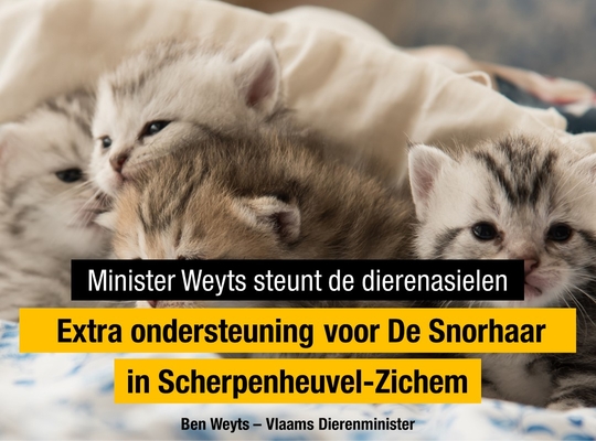 Vlaams Dierenminister Ben Weyts (N-VA) geeft € 6.266 financiële steun aan De Snorhaar vzw in Scherpenheuvel-Zichem. Tot voor amper een paar jaar geleden kregen dierenasielen geen enkele structurele steun vanuit de overheid, maar nu maakt Weyts in totaal € 775.000 vrij voor de asielen. Bovenop de structurele steun kunnen de asielen ook nog rekenen op extra middelen als ze dieren opvangen die de Inspectie Dierenwelzijn in beslag genomen heeft bij dierenbeulen. “We investeren steeds meer in onze asielen, want ze zijn van onschatbare waarde in onze strijd voor méér dierenwelzijn. De Snorhaar vzw in Scherpenheuvel-Zichem doet fantastisch werk”, zegt Weyts. “De asielmedewerkers verdienen daarvoor alle waardering en steun.”